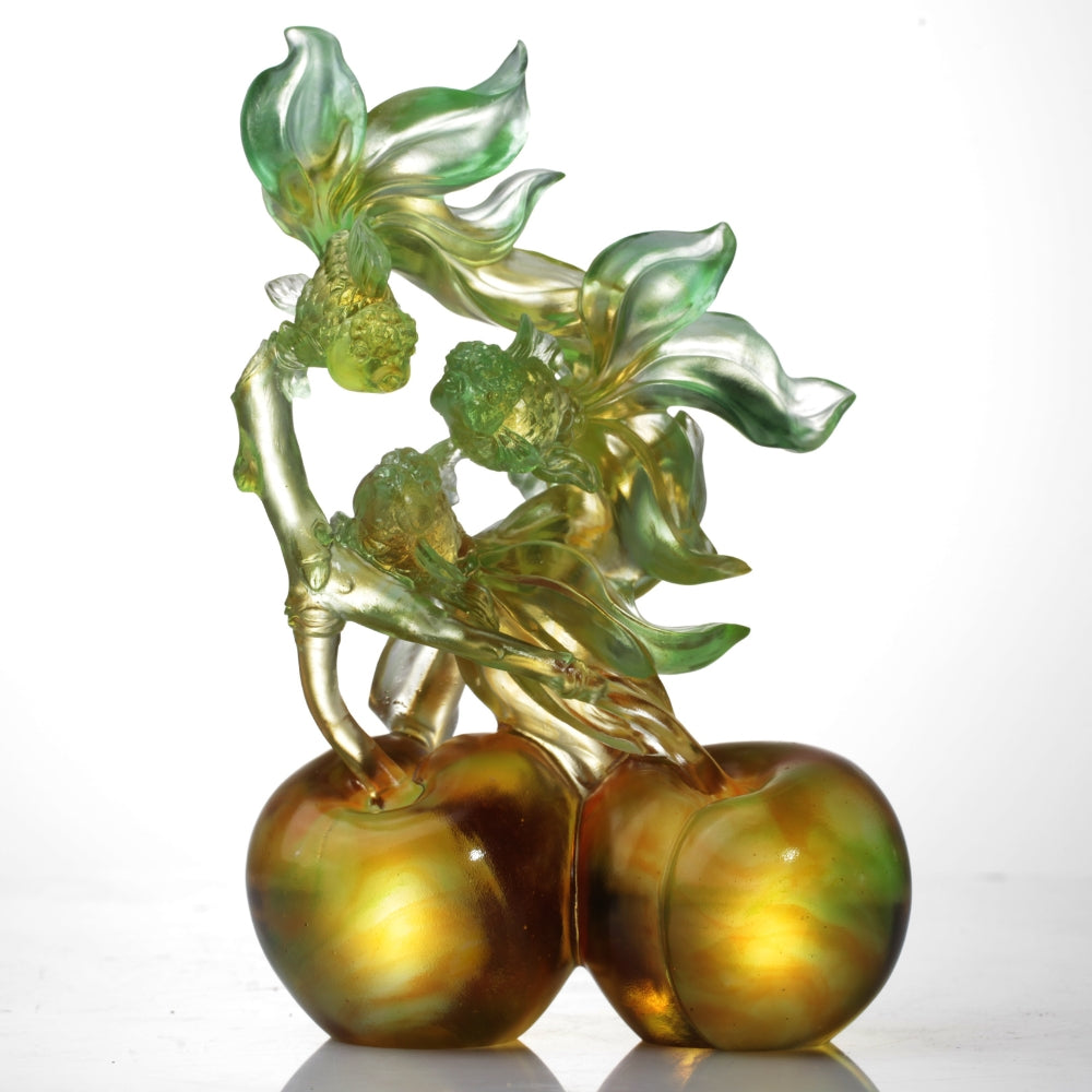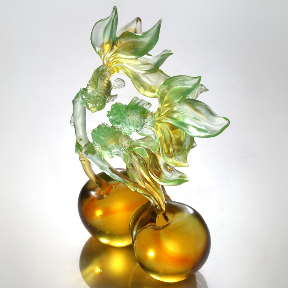 系列:幸福接二連三 作品設計概念: 兩顆飽滿熟透的李子為基礎,葉片向上延展,幻化為三尾靈動的金魚,光影中彼此呼應、相映成趣。果實象徵圓滿與收穫,金魚則寓意富貴吉祥。三尾金魚,則指「一生二,二生三,三生萬物」,象徵生生不息,福祿延綿。而「果實化為遊魚」的轉化,突破自然邏輯,充滿大膽詩意的想像。二者構築起一個「萬象更新」的夢想之境,打破了現實空間的壁壘。感受一種由實至願、由靜至動的能量傳遞。葉脈不再只是植物的一部分,而成為祝福的延續與昇華。魚騰躍其上,象徵祥瑞之氣不斷生髮;果實則穩健地承接於下,彼此形成一個共生的成長。不僅展示出卓然不群的煥新想像,也蘊含著「和而不同,互為成就,彼此頌贊」的處世哲學,是一場關於圓滿、願力與共好的生命禮贊。 |