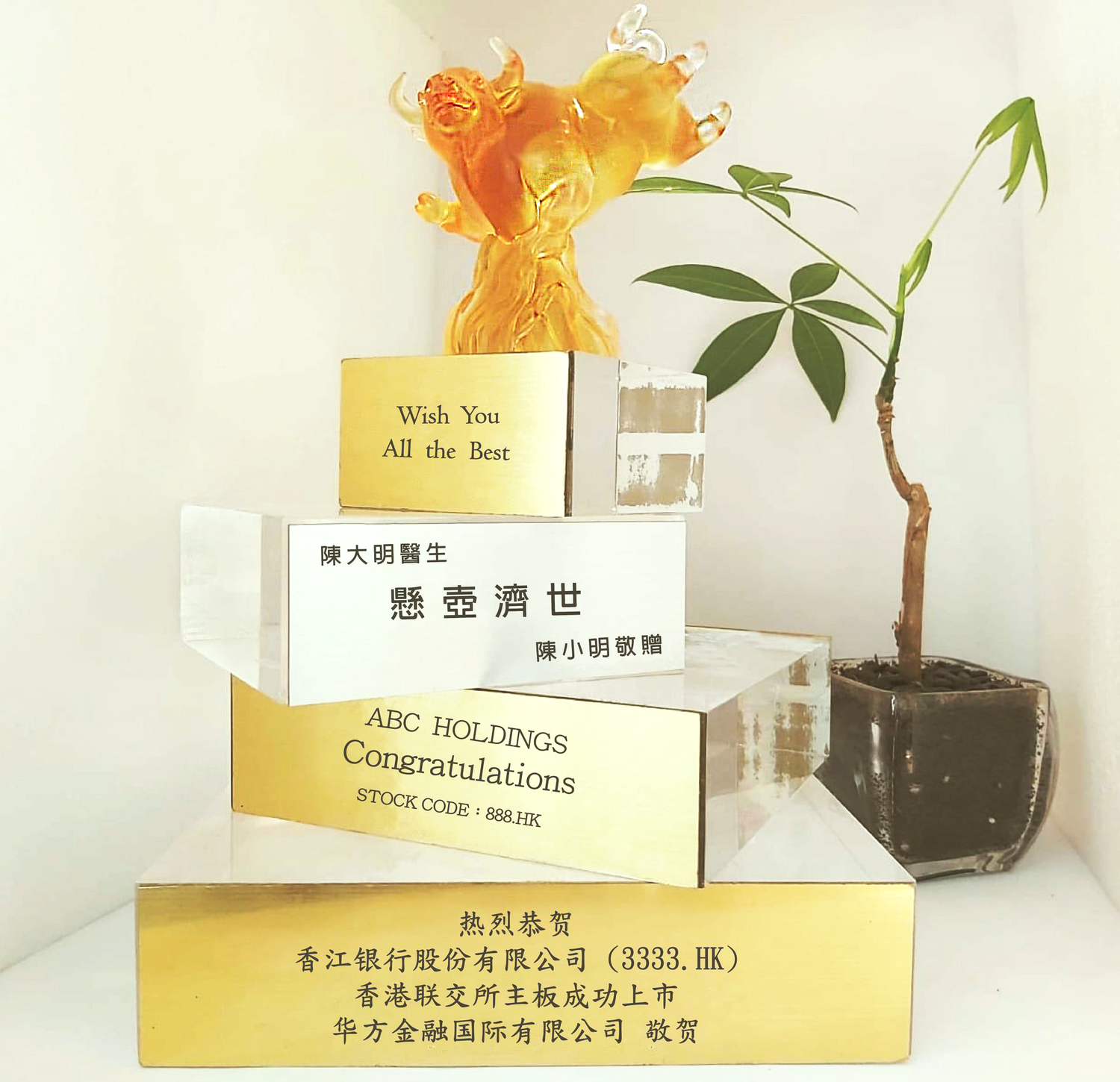 刻字以銅片製作,鑲鑄在水晶底座,銅片可選擇金色、銀色及不同字體,刻字内容可自訂,我們亦可提供專業建議。